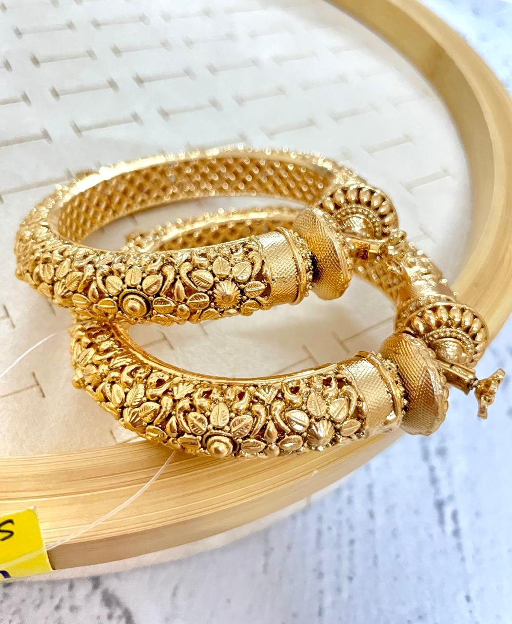 The Temple Design Bangle features intricate carvings inspired by traditional temple jewelry. Finished with antique-style one gram gold polish, this bangle gives a royal and cultural appeal. Ideal for weddings, festivals, and religious ceremonies, it pairs beautifully with sarees and ethnic outfits. Designed to look grand yet comfortable to wear.